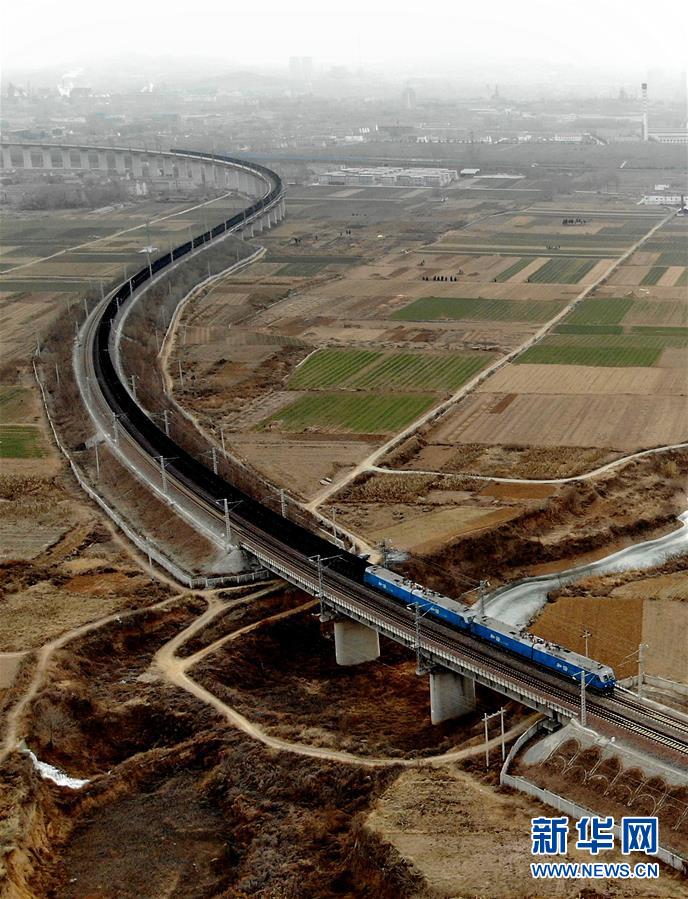 1月15日,一列重載列車行駛在瓦日鐵路紅旗渠至水冶南區(qū)段(無人機拍攝)。 新華社記者李安攝