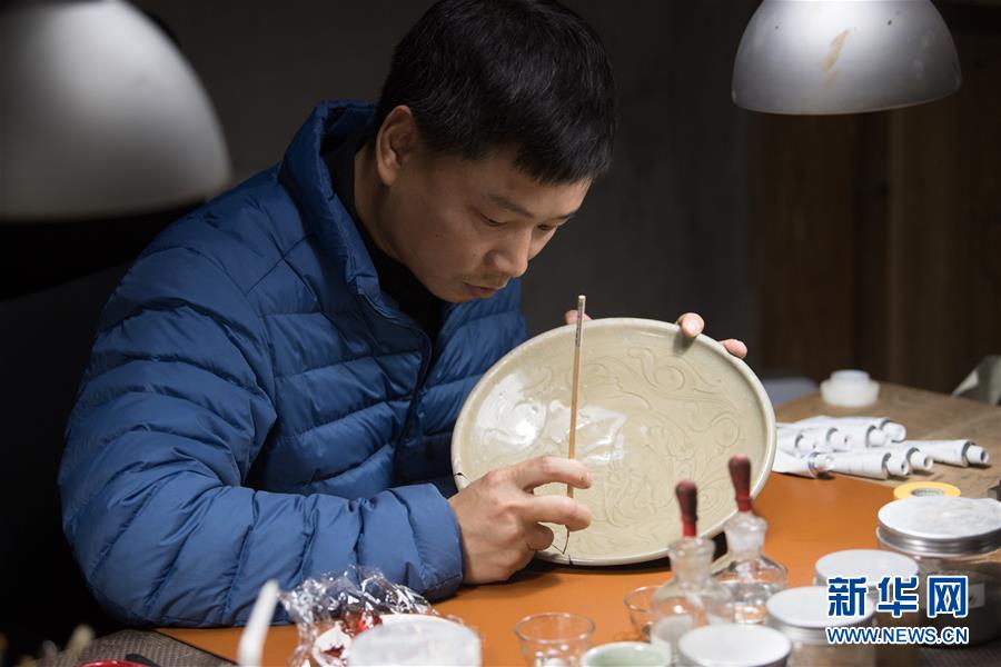 1月15日,吳榮強(qiáng)在龍泉市牛頭嶺村“七分醉”工作室對一件青瓷器皿進(jìn)行漆繕。