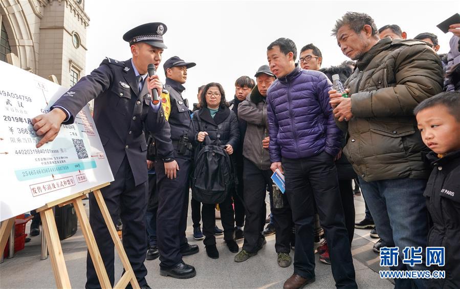 1月16日,民警講解真假火車票辨識(shí)方法。 當(dāng)日,武漢鐵路公安處在漢口火車站舉行警營開放日活動(dòng),讓旅客零距離接觸警務(wù)安全工作,營造良好的春運(yùn)出行環(huán)境。 新華社記者程敏攝