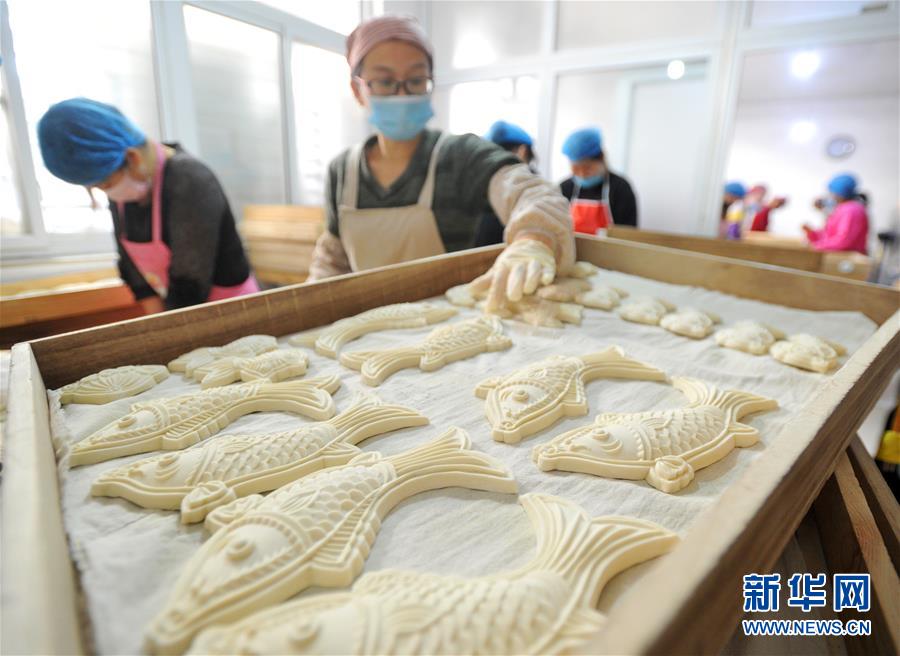1月31日,河北黃驊市一家面花作坊的工人用面花模子制作面花。 河北黃驊市有著過年蒸面花的習(xí)俗。春節(jié)前夕,當(dāng)?shù)孛婊ㄖ谱鞴S加班加點制作面花,供應(yīng)春節(jié)市場。 新華社記者牟宇攝