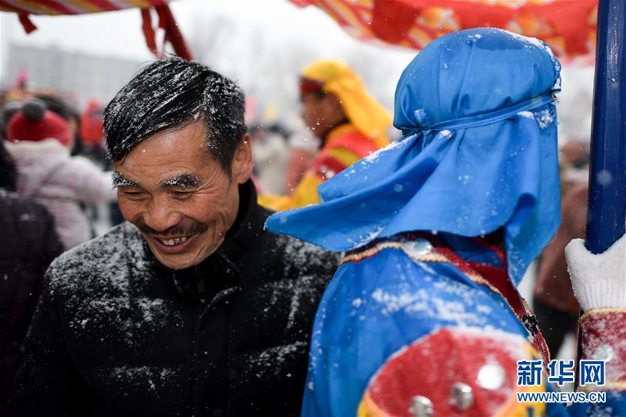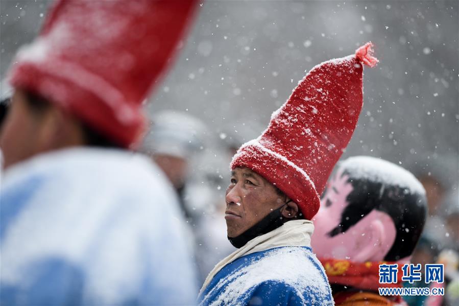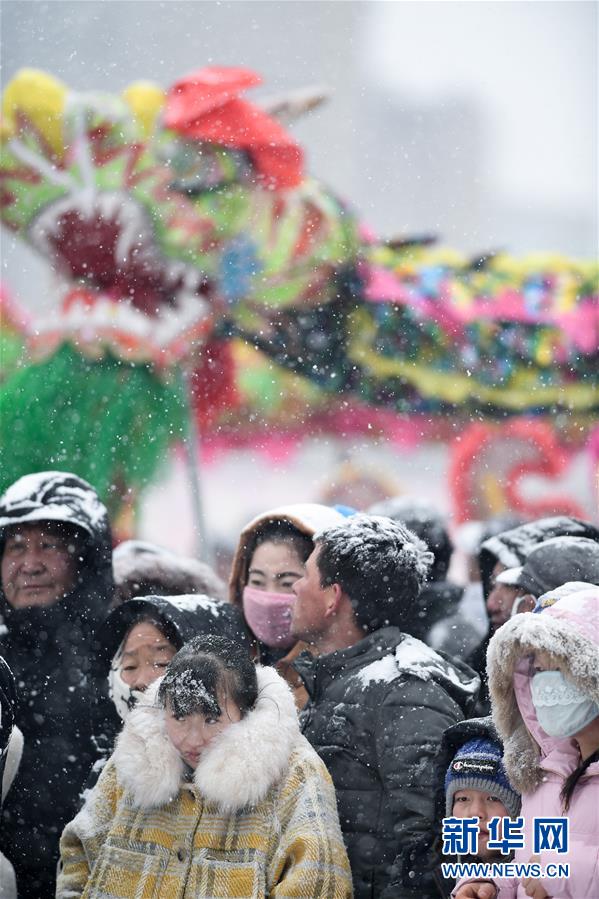 2月16日,群眾在青海省大通回族土族自治縣文化廣場(chǎng)冒雪觀看社火表演。新華社記者吳剛攝