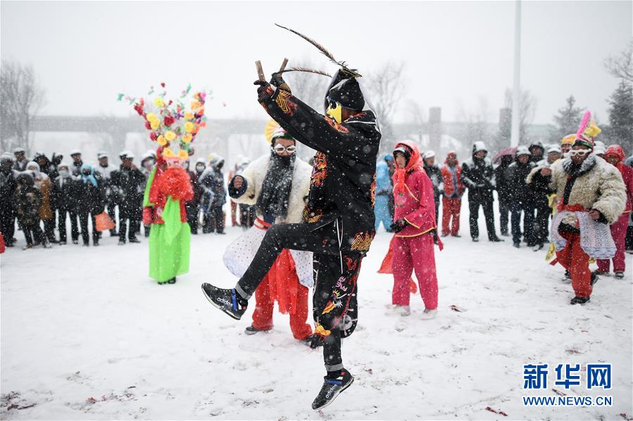 2月16日,社火隊(duì)演員在青海省大通回族土族自治縣文化廣場(chǎng)表演。