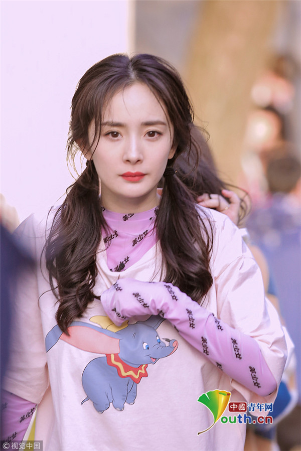 楊冪穿粉衣扎雙馬尾甜美可愛 身材纖細元氣滿滿