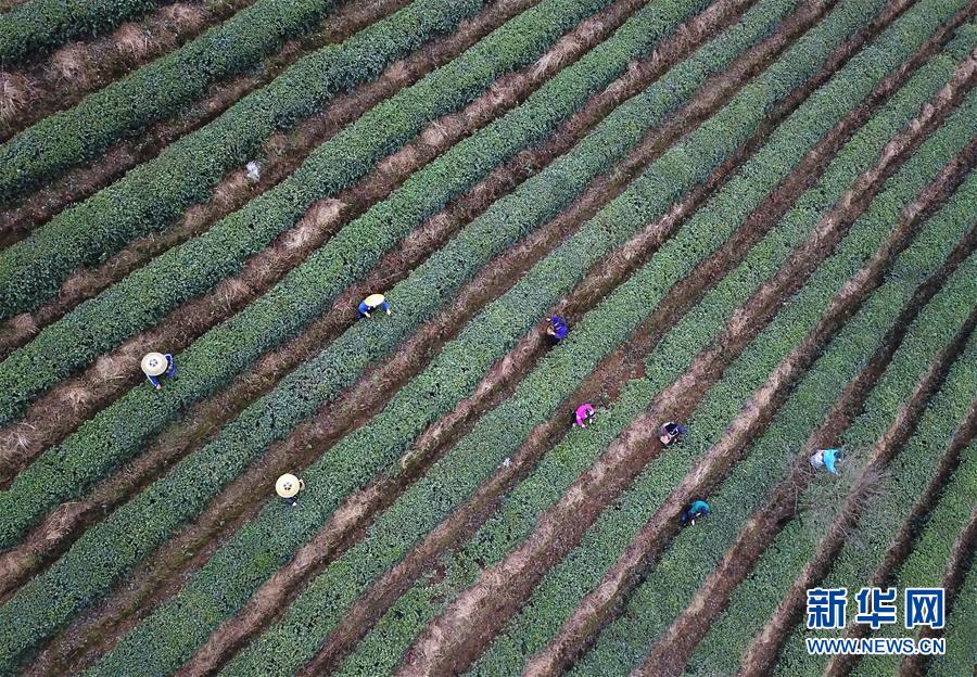 3月17日,采茶工在丹寨縣龍泉鎮(zhèn)馬寨村的茶園里采摘春茶(無(wú)人機(jī)拍攝)。新華社記者 楊文斌 攝