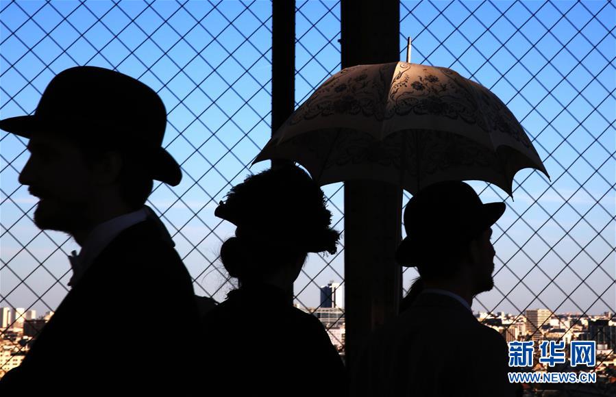 3月30日,在法國巴黎,音樂劇《300米高塔》的演員身著19世紀(jì)服裝站在埃菲爾鐵塔一層平臺上。于1889年3月31日正式落成的法國巴黎埃菲爾鐵塔迎來130歲生日。從30日起,包括演出、冒險(xiǎn)游戲、圖片展在內(nèi)的多項(xiàng)活動(dòng)在埃菲爾鐵塔舉行,為這座宏偉建筑慶生。新華社記者 高靜 攝