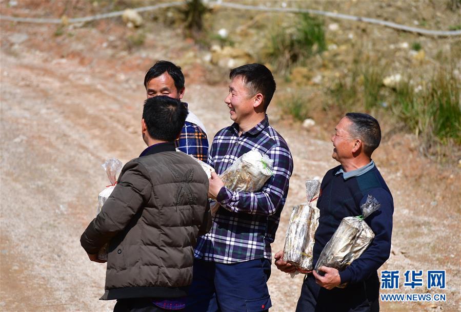 在廣西融水苗族自治縣桿洞鄉(xiāng)堯告村,貧困戶在苗坪嶺藥材種植專業(yè)合作社里領(lǐng)取靈芝菌棒(3月11日攝)。