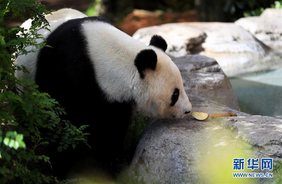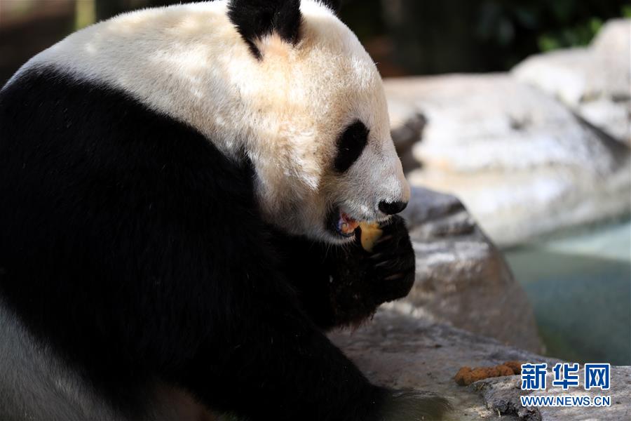 4月6日,在美國圣迭戈動(dòng)物園熊貓館,大熊貓“白云”在吃水果。新華社記者李穎攝