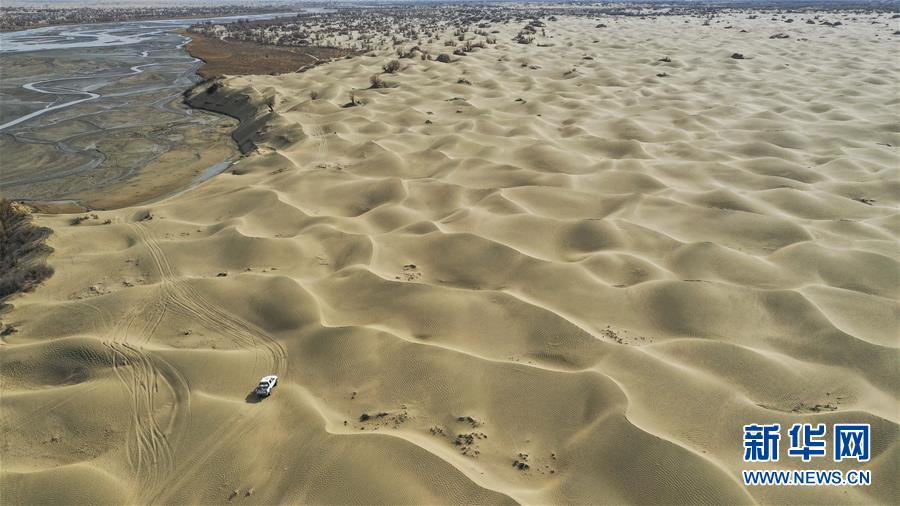 依明乘坐的汽車(chē)行駛在塔克拉瑪干沙漠中。從依明家坐車(chē)前往于田縣城,全程不足300公里,越野車(chē)需行駛7小時(shí)左右(3月19日無(wú)人機(jī)拍攝)。