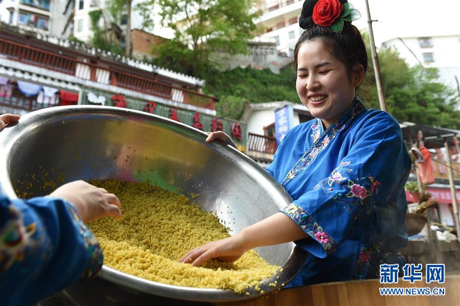 4月16日,在貴州省臺(tái)江縣姊妹街哆蝶五彩姊妹飯?bào)w驗(yàn)店,苗家婦女在制作五彩“姊妹飯”。新華社發(fā)(劉開(kāi)福 攝)