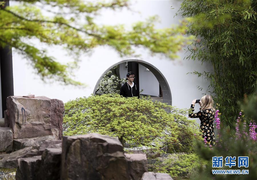 2017年4月27日,游客在美國(guó)紐約寄興園內(nèi)拍照。仿照中國(guó)蘇州園林設(shè)計(jì)建造的寄興園位于紐約斯塔滕島,占地面積約4000平方米,其所用的建筑材料大都在蘇州加工制造,并由40名來(lái)自蘇州的藝術(shù)家和工匠歷時(shí)6個(gè)月在紐約修建而成。 新華社記者王迎攝