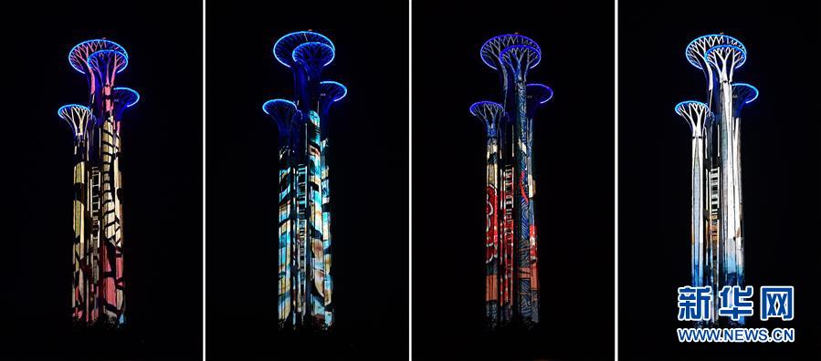4月26日,北京中軸線上演“空間光影秀”(拼版照片)。 新華社記者 李賀 攝