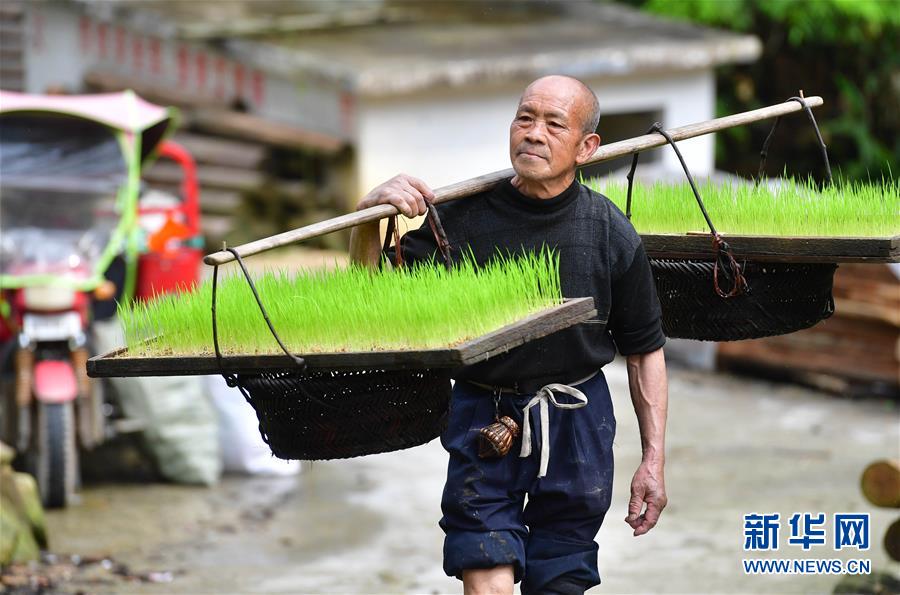在黔桂烏英苗寨,村民挑著秧苗去插秧(4月18日攝)。