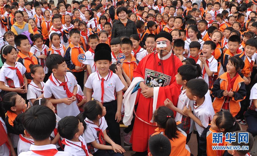 5月8日,滄州市小鳳霞評劇團(tuán)演員在肅寧縣第三實驗小學(xué)與學(xué)生互動。