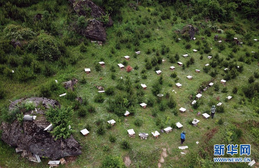 5月10日,在甘肅省隴南市徽縣大河店鎮(zhèn)硬灣村,蜂農(nóng)查看蜂箱情況(無(wú)人機(jī)拍攝)。 甘肅省隴南市徽縣大河店鎮(zhèn)硬灣村位于秦巴山區(qū)深處,2017年,在當(dāng)?shù)卣姆龀窒?,龍崖老巢蜜養(yǎng)殖農(nóng)民專業(yè)合作社成立,蜂農(nóng)們將傳統(tǒng)養(yǎng)蜂技藝和現(xiàn)代加工方式相結(jié)合,并通過電商等渠道打開銷路,有效帶動(dòng)了當(dāng)?shù)刎毨Т迕衩撠氈赂?。目前整個(gè)合作社共有蜂箱2000余個(gè),每箱每年可帶來(lái)三四千元的收入。 新華社記者 馬寧 攝