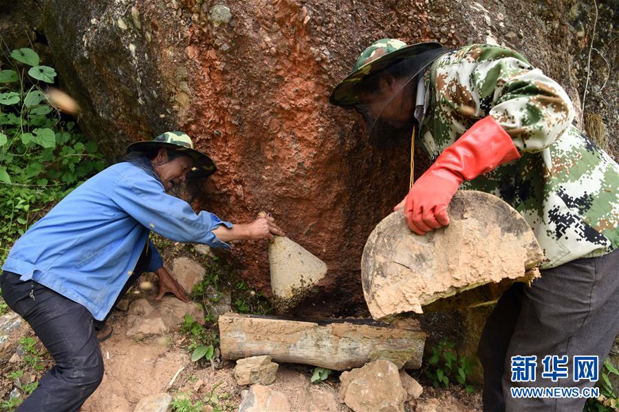 5月10日,在甘肅省隴南市徽縣大河店鎮(zhèn)硬灣村,蜂農(nóng)李成(左)和劉輝林在收蜂。 甘肅省隴南市徽縣大河店鎮(zhèn)硬灣村位于秦巴山區(qū)深處,2017年,在當(dāng)?shù)卣姆龀窒拢堁吕铣裁垧B(yǎng)殖農(nóng)民專業(yè)合作社成立,蜂農(nóng)們將傳統(tǒng)養(yǎng)蜂技藝和現(xiàn)代加工方式相結(jié)合,并通過(guò)電商等渠道打開銷路,有效帶動(dòng)了當(dāng)?shù)刎毨Т迕衩撠氈赂?。目前整個(gè)合作社共有蜂箱2000余個(gè),每箱每年可帶來(lái)三四千元的收入。 新華社記者 馬寧 攝
