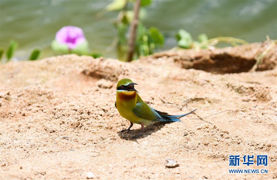 5月14日,栗喉蜂虎在沙地上活動。 新華社記者 楊冠宇 攝