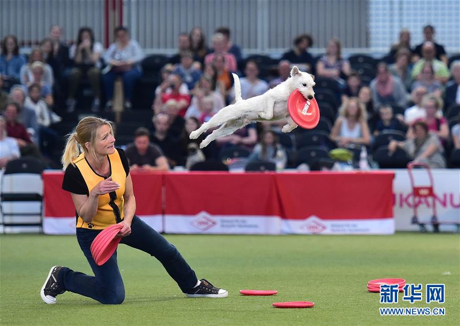 5月19日,在德國(guó)多特蒙德舉行的寵物展上,訓(xùn)犬師沃爾夫帶著愛犬進(jìn)行“狗接飛盤”表演。 為期三天的德國(guó)多特蒙德“狗和貓”寵物展19日落幕。寵物展期間,人們帶著自己的“萌寵”來到會(huì)場(chǎng),參與寵物跳水、舞蹈、選美等趣味比賽,并與其他寵物愛好者及展商交流互動(dòng)。 新華社記者逯陽攝