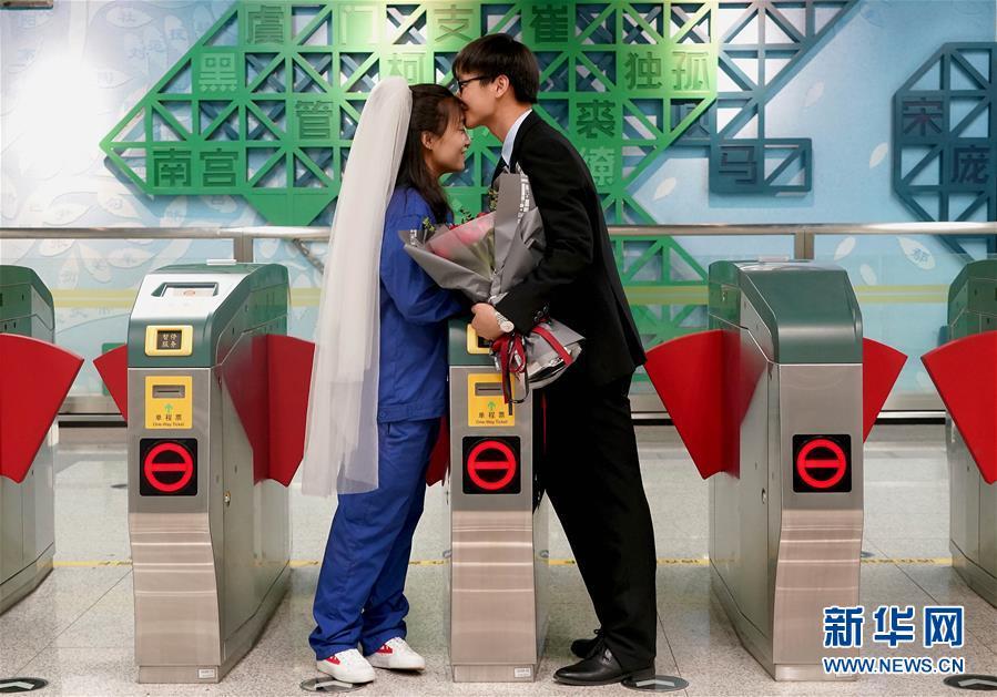 5月20日,兩名參與地鐵5號(hào)線建設(shè)的工作人員在求婚后拍照留念。 當(dāng)日,鄭州地鐵5號(hào)線開始初期運(yùn)營。作為鄭州軌道交通線網(wǎng)中首條環(huán)線,5號(hào)線全長40余公里,設(shè)站32座。 新華社記者李安攝