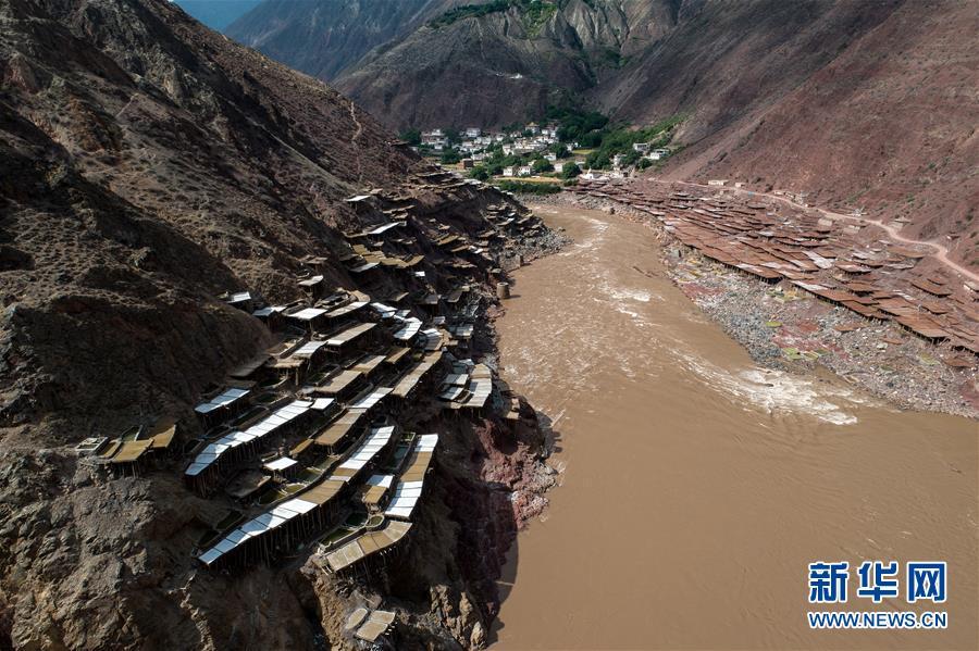 這是西藏芒康縣納西民族鄉(xiāng)的古鹽田景觀(5月22日無人機拍攝)。 位于西藏昌都芒康縣瀾滄江畔的古鹽田,至今仍保持最原始的手工曬鹽方式。據(jù)史料記載,唐朝時期當?shù)鼐烷_始曬鹽。鹽田在瀾滄江兩岸依山而建,由多根木柱搭架,架上用透水性強的泥土鋪成平面夯實,當?shù)鼐用駨臑憸娼系柠}井、鹽池中取出鹵水倒入鹽田,經(jīng)陽光蒸曬、風(fēng)干,結(jié)晶成鹽。遠遠望去,鹽田錯落有致,田中鹵水宛若鏡面,形成壯麗奇觀。 新華社記者 李鑫 攝