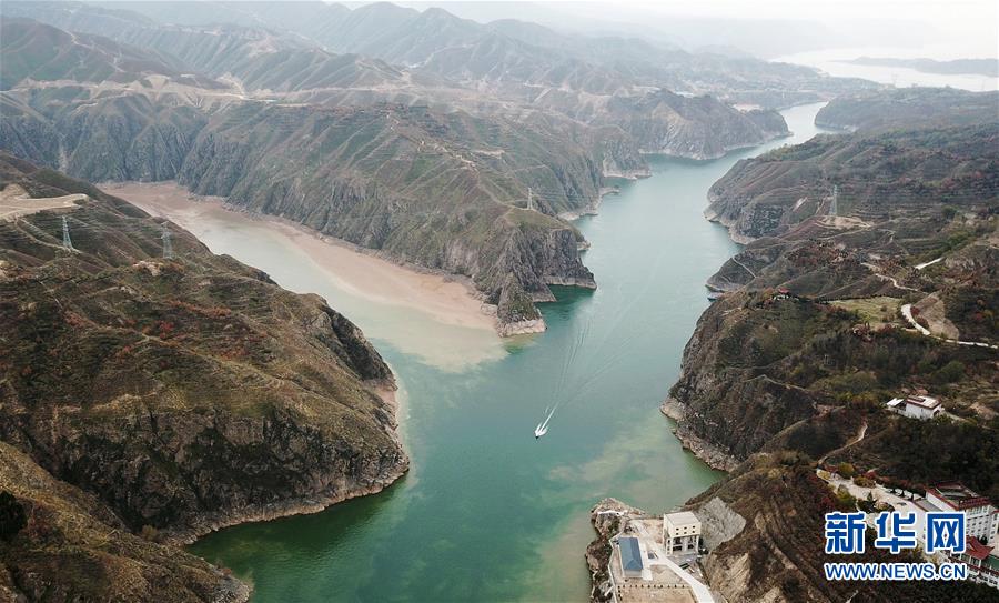 10月24日,一艘快艇從劉家峽水庫庫區(qū)的洮河與黃河交匯處駛過(無人機拍攝)。 新華社記者 陳斌 攝
