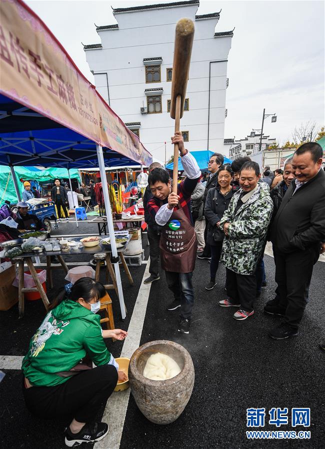11月19日,商戶在廟會(huì)現(xiàn)場展示傳統(tǒng)打年糕。 新華社記者 徐昱 攝
