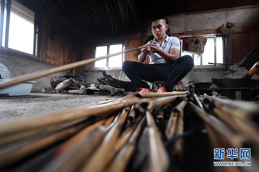5月30日,在融水苗族自治縣安太鄉(xiāng)小桑村青山屯,杜信文在挑選熏干的竹子準備做蘆笙。 新華社記者 陸波岸 攝