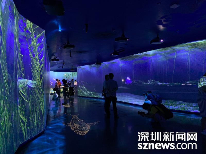 一進(jìn)館,潛入深海的氣息撲面而來,海底生物在身邊若隱若現(xiàn),海底卷起細(xì)小的漩渦,遠(yuǎn)處,神秘的海魚跟你打個(gè)照面,轉(zhuǎn)身離開,海底生物和海浪的聲音環(huán)繞耳旁,逼真的特效、巧妙的互動機(jī)制讓人身臨其境,猶如穿越到藍(lán)色大海里,與魚兒作伴,與水母交友,令人沉醉于亦夢亦真的海底世界。