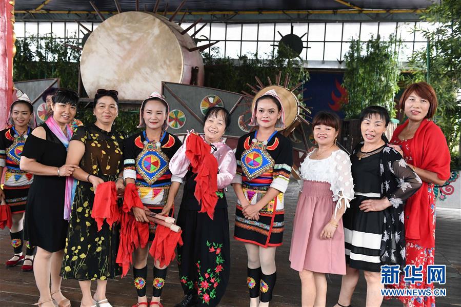 游客與基諾族大鼓舞演員合影(6月1日攝)。 在云南省西雙版納傣族自治州景洪市基諾山基諾族鄉(xiāng)的基諾族村寨,每天的基諾大鼓舞表演吸引了眾多游客前來觀賞體驗(yàn),帶動(dòng)了基諾族群眾就業(yè)和增收。基諾族大鼓舞蘊(yùn)涵豐富的歷史文化內(nèi)涵,已被列入國家級(jí)非物質(zhì)文化遺產(chǎn)保護(hù)名錄。 新華社記者 楊宗友 攝