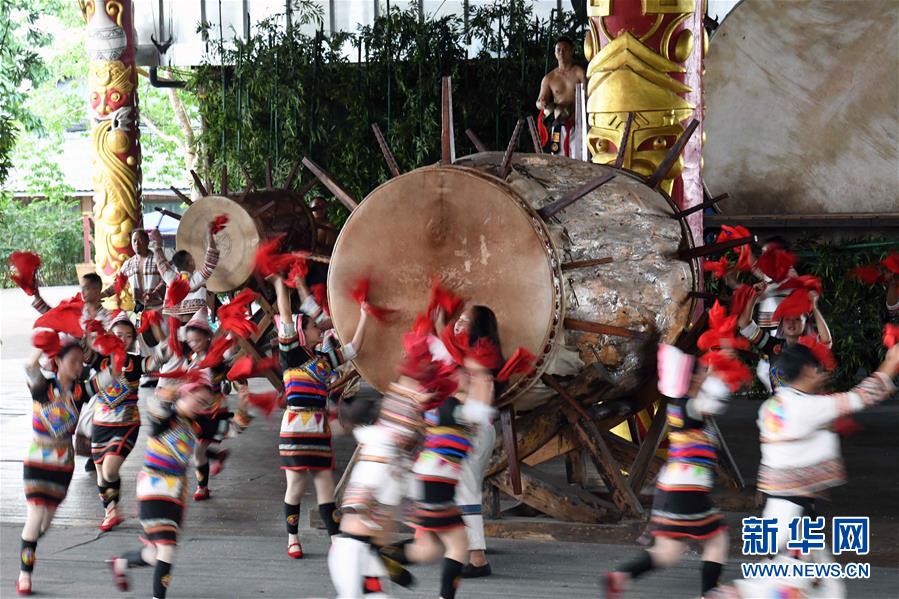 基諾族演員在表演大鼓舞(6月1日攝)。 在云南省西雙版納傣族自治州景洪市基諾山基諾族鄉(xiāng)的基諾族村寨,每天的基諾大鼓舞表演吸引了眾多游客前來觀賞體驗,帶動了基諾族群眾就業(yè)和增收?;Z族大鼓舞蘊涵豐富的歷史文化內(nèi)涵,已被列入國家級非物質(zhì)文化遺產(chǎn)保護名錄。 新華社記者 楊宗友 攝