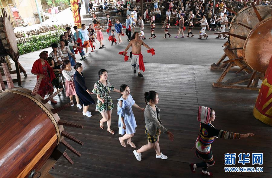 游客與基諾族大鼓舞演員一起跳舞(6月1日攝)。 在云南省西雙版納傣族自治州景洪市基諾山基諾族鄉(xiāng)的基諾族村寨,每天的基諾大鼓舞表演吸引了眾多游客前來觀賞體驗,帶動了基諾族群眾就業(yè)和增收?;Z族大鼓舞蘊(yùn)涵豐富的歷史文化內(nèi)涵,已被列入國家級非物質(zhì)文化遺產(chǎn)保護(hù)名錄。 新華社記者 楊宗友 攝