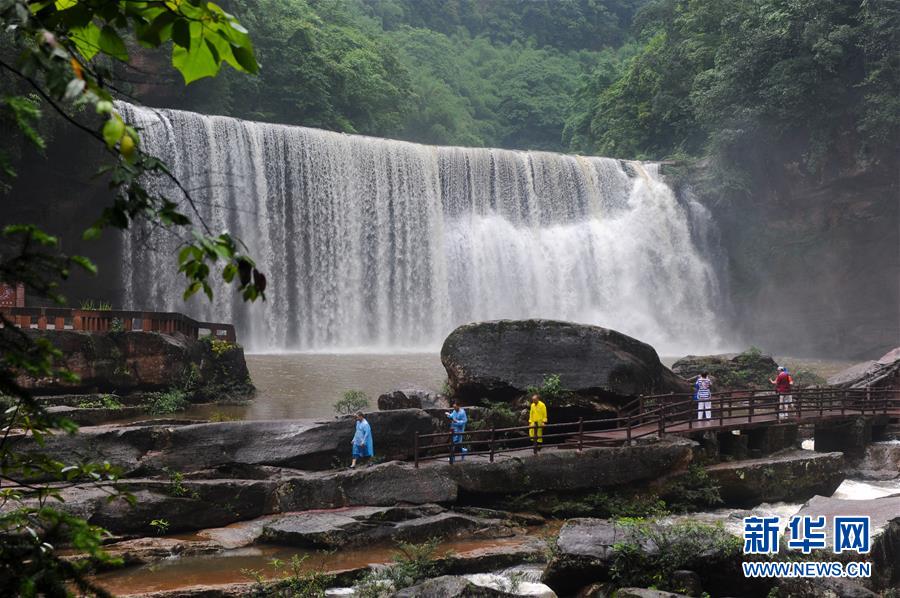6月5日,游人在貴州赤水丹霞旅游區(qū)“美人梳”瀑布游覽。 貴州遵義赤水市有眾多大大小小的瀑布群,素有“千瀑之市”的美譽(yù),飛瀑美景吸引八方游客前來(lái)賞景度假。 新華社記者鄭雅寧攝