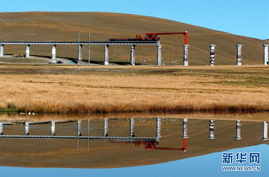 青藏鐵路在架橋施工中(2004年資料照片)。新華社記者覺(jué)果攝