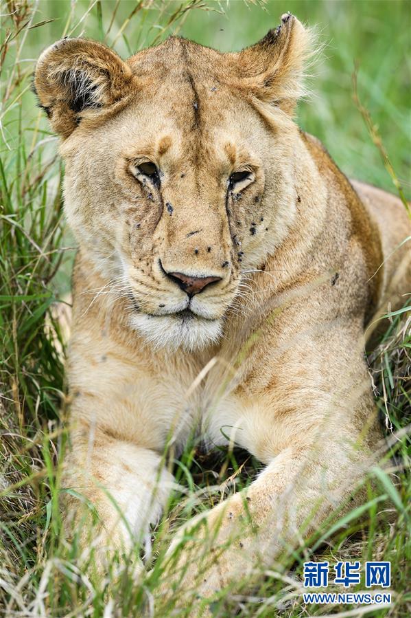 6月17日,在肯尼亞馬賽馬拉國(guó)家保護(hù)區(qū),一頭獅子在草叢中休息。 新華社記者 李琰 攝