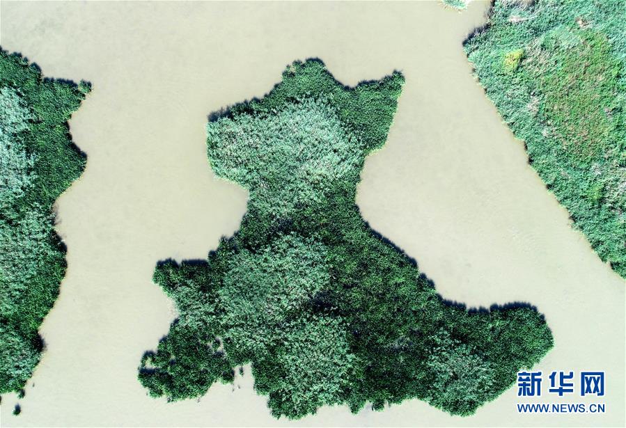這是天津市寧河區(qū)七里海濕地內(nèi)蘆葦和水面形成的圖案(6月22日無(wú)人機(jī)拍攝)。新華社記者 岳月偉 攝