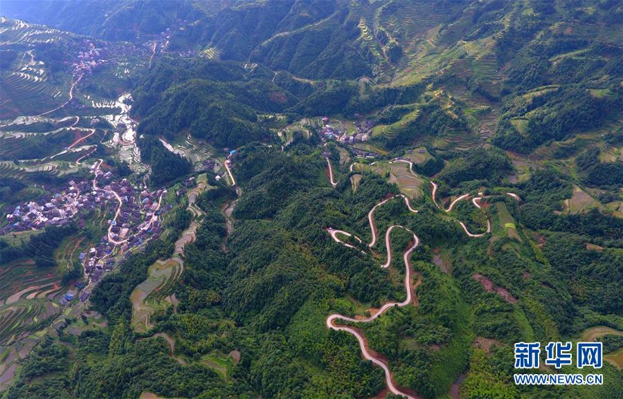這是融水苗族自治縣桿洞鄉(xiāng)百秀村孔門(mén)苗寨的公路(6月14日無(wú)人機(jī)拍攝)。新華社記者 黃孝邦 攝