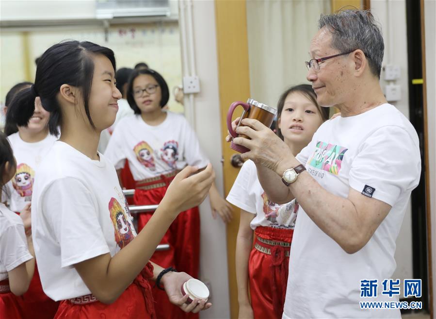 孩子們給79歲的粵劇名伶楊劍華敬茶(6月8日攝)。 聲輝粵劇推廣協(xié)會(huì)成立于2003年,是香港重要粵劇藝術(shù)團(tuán)體之一,致力于向青少年推廣粵劇。協(xié)會(huì)目前有兩個(gè)初班,3個(gè)中班,一個(gè)青少年班。粵劇又稱(chēng)“廣東大戲”,表演技藝包括“唱做念打”,即唱功、身段、臺(tái)詞、武打,主要流行于廣東、廣西和香港、澳門(mén)等地區(qū)。2009年,粵劇被列入聯(lián)合國(guó)教科文組織人類(lèi)非物質(zhì)文化遺產(chǎn)代表作名錄,今年正逢十周年。 新華社記者 吳曉初 攝