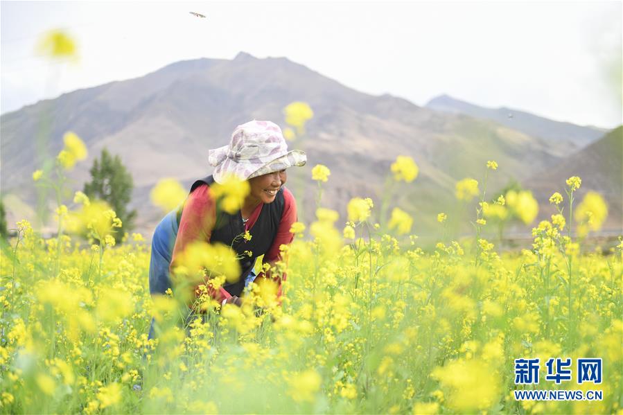 7月2日,拉薩市堆龍德慶區(qū)朗巴鄉(xiāng)村民玉珍在打理油菜花田。 近日,西藏各地的油菜花盛開(kāi),呈現(xiàn)出生機(jī)勃勃的夏日美景。 新華社記者 晉美多吉 攝