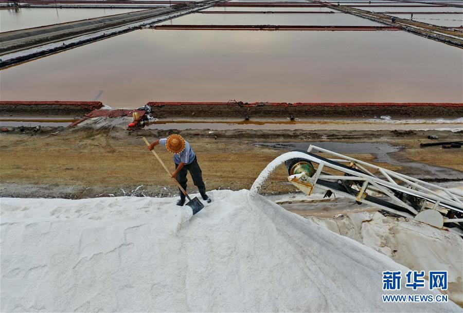 7月3日,唐山海港經(jīng)濟(jì)開(kāi)發(fā)區(qū)大清河鹽場(chǎng)的工人在鹽堆上工作。新華社記者 楊世堯 攝