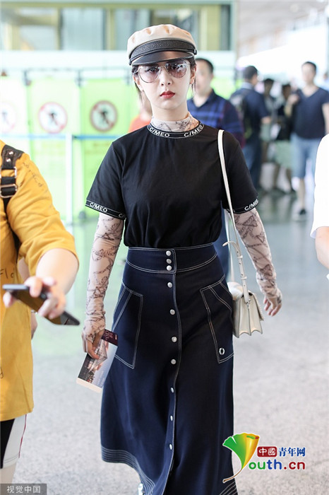 2019年7月25日,北京,楊紫現(xiàn)身機場。她穿黑色短T配牛仔裙變時髦女郎,戴報童帽架墨鏡”港風女sir“即視感,人氣爆棚。