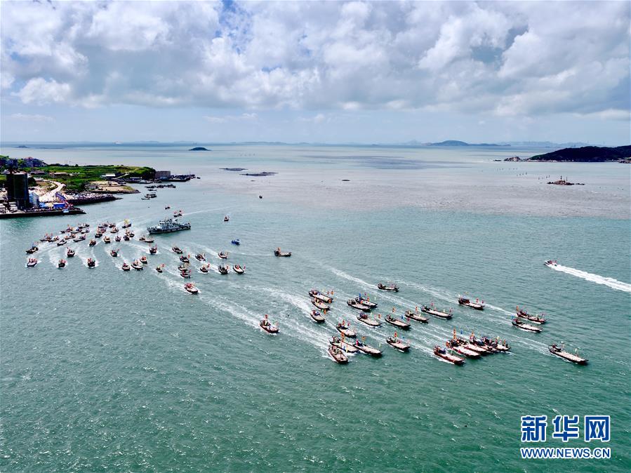 8月3日,在首屆福清開漁節(jié)上,漁船駛向大海(無人機拍攝)。新華社記者姜克紅攝