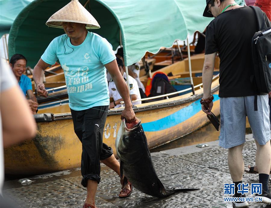7月27日,在西昌邛海,一名漁民捕得一條大魚(yú)。新華社記者江宏景攝