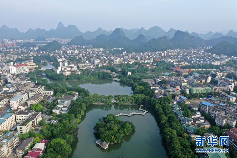 桂林市榕湖附近景觀(7月1日無人機(jī)拍攝)。 夏日時(shí)節(jié),廣西桂林市區(qū)內(nèi)的榕湖、杉湖、桂湖、木龍湖等地綠樹成蔭、景色迷人。 新華社記者陸波岸攝