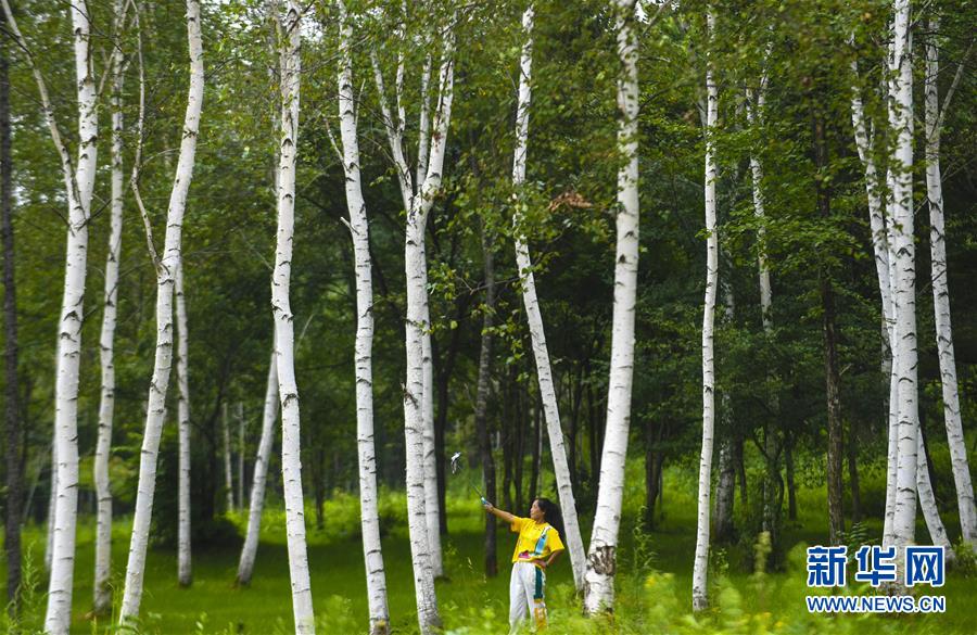 8月8日,游客在伊春市九峰山養(yǎng)心谷景區(qū)白樺林里自拍。 時(shí)值八月,黑龍江省伊春市林區(qū)空氣清新,涼爽宜人,吸引眾多游客。 新華社記者李曉果攝