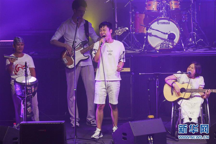 8月14日,8772樂(lè)隊(duì)成員田霄(中)在演唱會(huì)上表演。新華社記者張玉薇攝