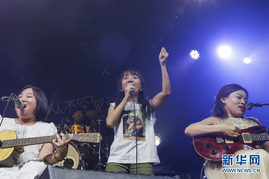 8月14日,8772樂隊(duì)發(fā)起人、隊(duì)長王奕鷗(中)和樂隊(duì)成員崔瑩(左)、程利婷在演唱會上表演。新華社記者張玉薇攝