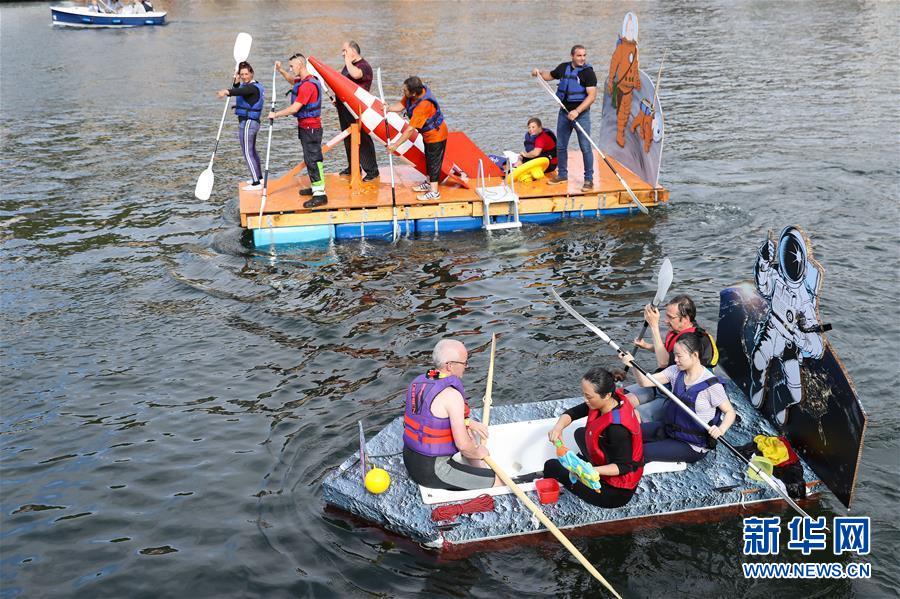 當(dāng)日,一年一度的水上狂歡活動(dòng)“浴缸劃船節(jié)”在比利時(shí)迪南舉行。該活動(dòng)要求參賽者制造的船上至少帶有一個(gè)浴缸,參賽者需完成一千米的水上巡游,最后根據(jù)設(shè)計(jì)創(chuàng)意及現(xiàn)場表演而非行進(jìn)速度評選出優(yōu)勝者?!霸「讋澊?jié)”始于1982年,今年的主題是"我們在月球漫步"。 新華社記者 張鋮 攝
