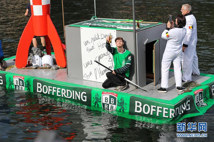 8月15日,在比利時南部小城迪南的默茲河上,人們參加“浴缸劃船節(jié)”的表演。新華社記者 張鋮 攝