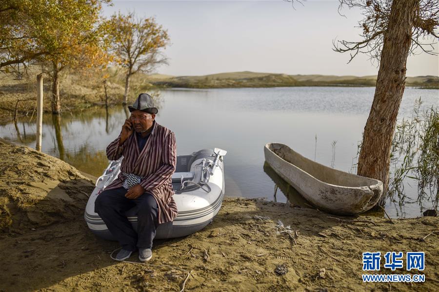 在羅布人村寨,阿木東·艾不東坐在湖邊接電話(huà)(2018年10月16日攝)。在旅游旺季,游客會(huì)通過(guò)電話(huà)提前向阿木東預(yù)約羅布烤魚(yú)。新華社記者 趙戈 攝