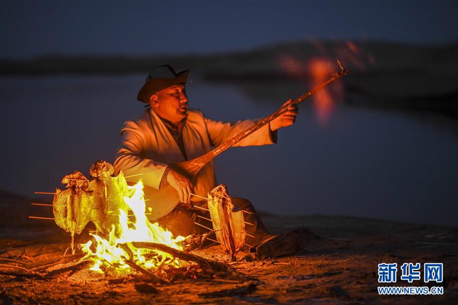 在羅布人村寨,阿木東·艾不東在沙漠里的一處海子旁彈奏樂(lè)器,等待烤魚(yú)烤熟(4月11日攝)。新華社記者 盧燁 攝