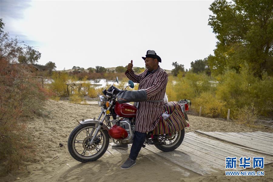 在羅布人村寨,阿木東·艾不東騎著摩托車向游客打招呼(2018年10月16日攝)。新華社記者 趙戈 攝